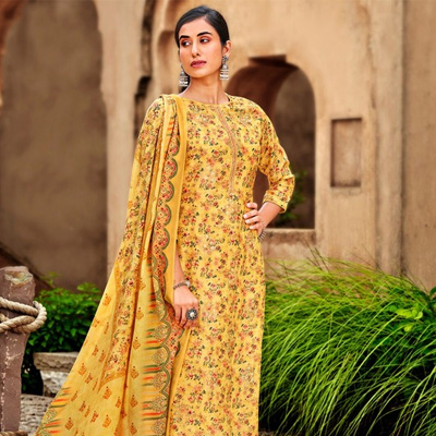 Yellow & Pink Printed Pure Silk Unstitched Dress Material