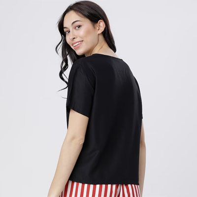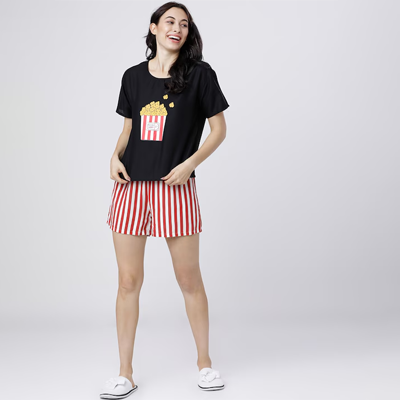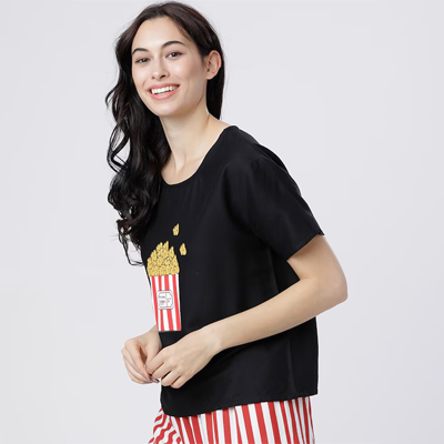 "Black and Red printed lounge top, has a round neck and short sleeves Size & Fit The model (height 5'8) is wearing a size S Material & Care Viscose rayon machine wash"