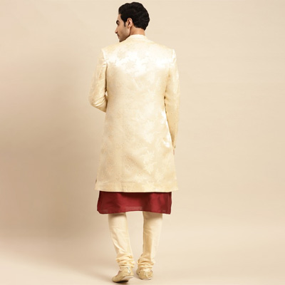 "Beige and maroon sherwani set Beige woven design sherwani, has a mandarin collar, a full button placket, long sleeves, straight hem, and multiple slits Maroon solid kurta, has a mandarin collar, half button placket, long sleeves, a straight hem, and side slits Beige solid churidar has a drawstring closure Comes with a pocket square Size & Fit Regular Fit The model (height 6"") is wearing size M Material & Care Cotton Dry Clean"