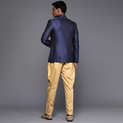 "This sherwani set consists of a Sherwani with salwar Navy blue woven design Sherwani, has a mandarin collar, long sleeves, button placket, three pockets, side slits, attached pocket square, and a straight hem A pair of golden solid mid-rise pyjamas, has drawstring fastening Size & Fit Size worn by the model: M Chest: 40"" Waist: 33"" Hips: 37"" Height: 6'1"" Material & Care Sherwani fabric: Silk Blend Bottom fabric: Cotton Blend Dry Clean"