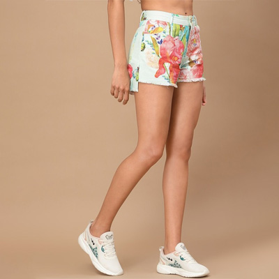 "Wear these trendy shorts and enjoy a laid-back Sunday outing. They are tailored with a classy floral print and . Stunning blue shade Beautiful floral print Button closure High-rise waist Denim, hand wash Trend Alert Designed in joyful and floral prints, summer shorts have a laid-back vibe and are perfect for the not-so-cool seasons. Made from schiffli, cotton, lace, linen, and denim, they feature interesting details, such as tie-ups, paper bag waists, frayed hems, cuffed hems, A-line fits, and oversized fits that make them stand apart. Size & Fit Regular Fit Size worn by the model: S Waist: 25"" Hips: 37.5"" Height: 5'6"" Material & Care 100% Cotton Hand wash "