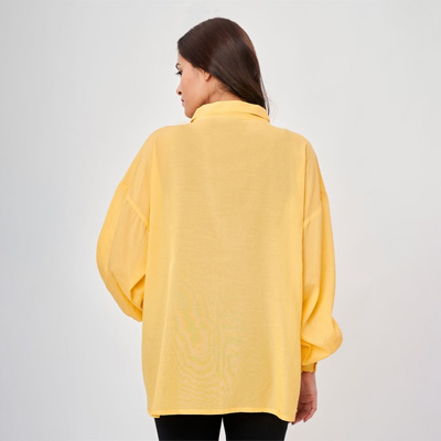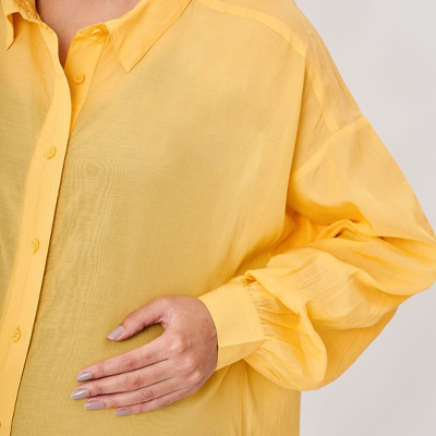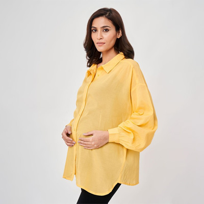 "Yellow solid opaque Maternity shirt ,has a spread collar, button placket, na pocket, three-quarter regular sleeves, straight hem Size & Fit Fit: Regular Fit The model (height 5'8) is wearing a size S Material & Care Cotton & Machine wash"