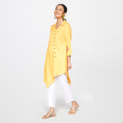 "Yellow solid tunic ,has a shirt collar, three-quarter sleeves, and asymmetric hem Size & Fit The model (height 5'8) is wearing a size S Material & Care 55% viscose 35% cotton 10% flex Machine wash"